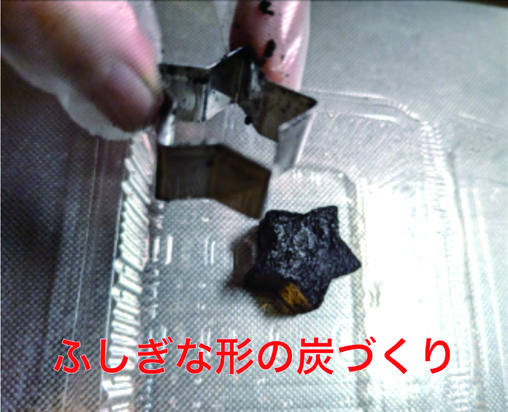 燃え残った小さい炭を使う成型ワークです。その昔、小さい炭を固めたものを「たどん」と呼んで燃料として資源活用していました。星型などの型をした「たどん」を作ってみませんか?消臭用や燃料として使えます。