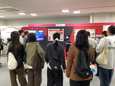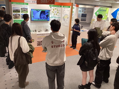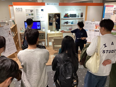 丸紅木材株式会社では、カーボンポジティブついてお伝えしました。国内の木材自給率50%達成ための課題、未利用木材の製品化、炭素固定量の見える化に関心を持たれて椅子や玩具を見られました。